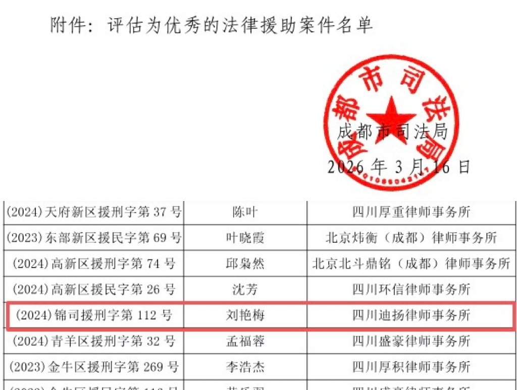 近日,成都市司法局正式发布《2025年度全市法律援助案件质量评估情况的通报》,对全市法律援助工作进行全面总结与表彰。经严格评审、层层遴选,全市共58件案件获评优秀法律援助案件。我所刘艳梅律师承办的(2024)锦司援刑字第112号刑事案件凭借规范办理、良好效果成功入选,充分彰显成都市司法局对我所法律援助工作的高度认可。